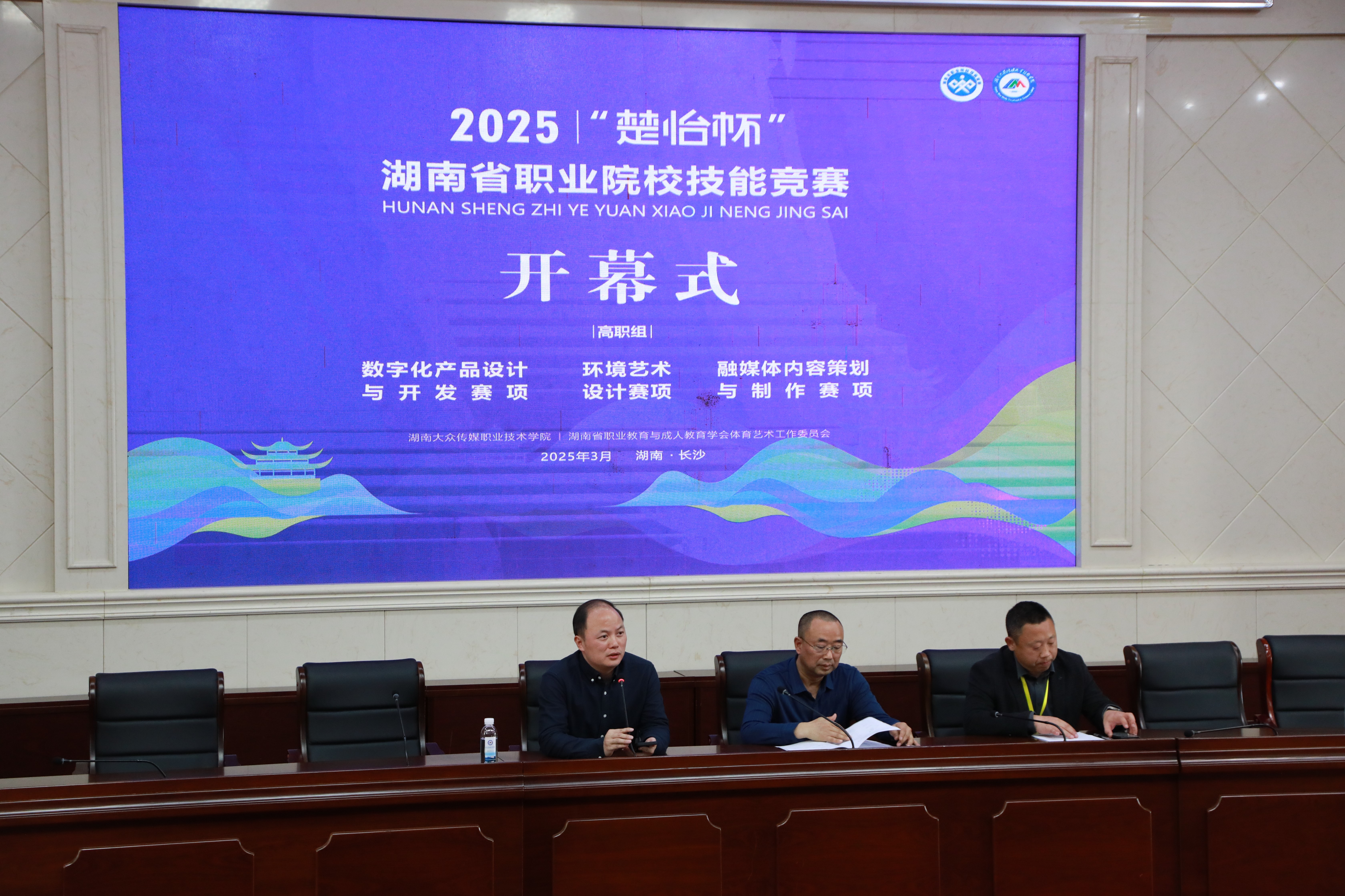 3月21日,由湖南省教育厅主办、我校新媒体技术学院承办的2025年度“楚怡杯”湖南省职业院校技能竞赛数字化产品与开发赛项,在学术报告厅举行隆重的开幕仪式。 全省22所职业院校38支队伍114名选手同台竞技,一展风采。比赛将评选出一、二、三等奖,并推荐优秀选手参加全国职业院校技能大赛。