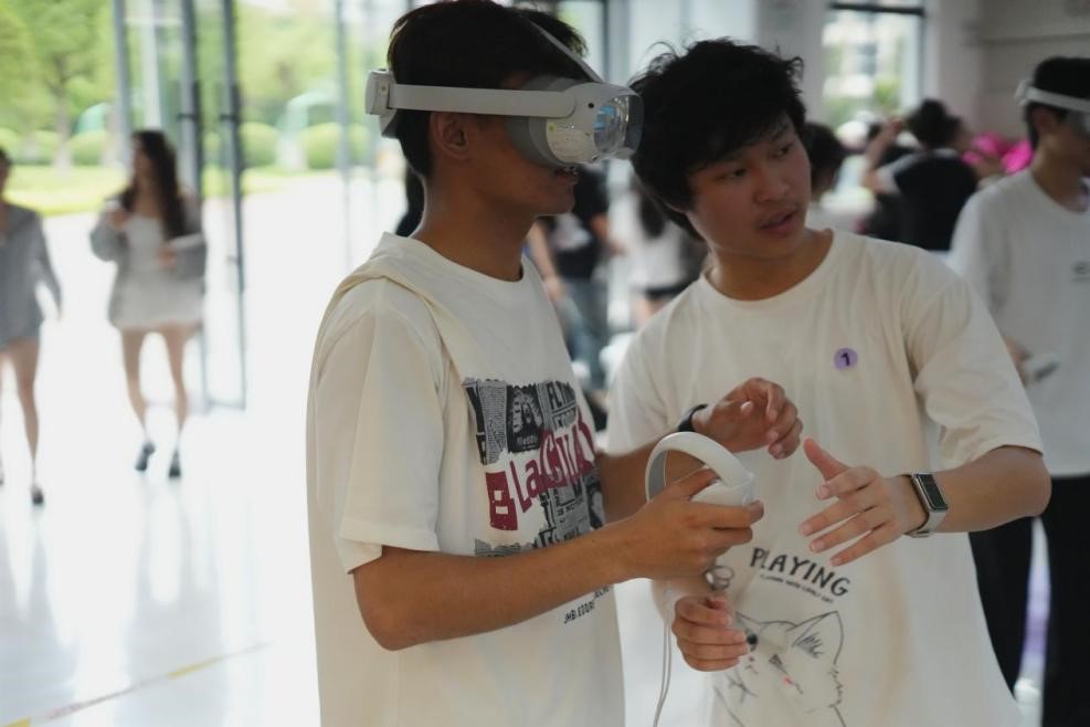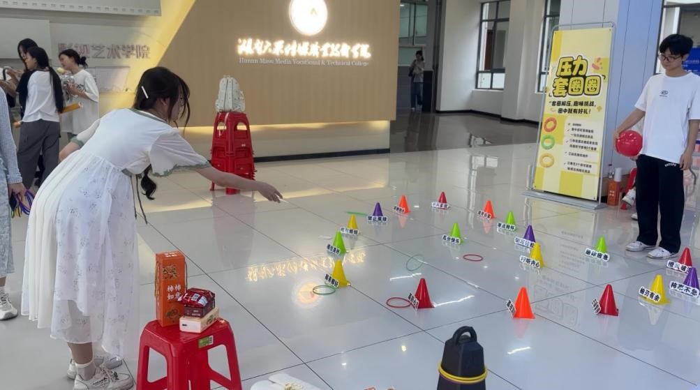 活动现场设置了“VR漫游者”“跃动飞行棋”“压力套圈圈”等学生喜闻乐见的游戏类型,吸引了几百名学生参与其中。学生通过VR亲身感受了“竞技羽毛球”的活力、“阳光放松屋”的舒缓与“疗愈咖啡馆”的治愈,以沉浸式方式探索心灵世界,在竞技游戏中释放压力。活动还以真人版飞行棋为载体,以压力盾牌为靶标,将心理活动融入体育运动与趣味挑战中。参加活动的学生表示:“这次心理活动真的太有趣了!这是我第一次用VR身临其境地感受心理疗愈场景,让我对心理活动和心理健康有了新的认识。”