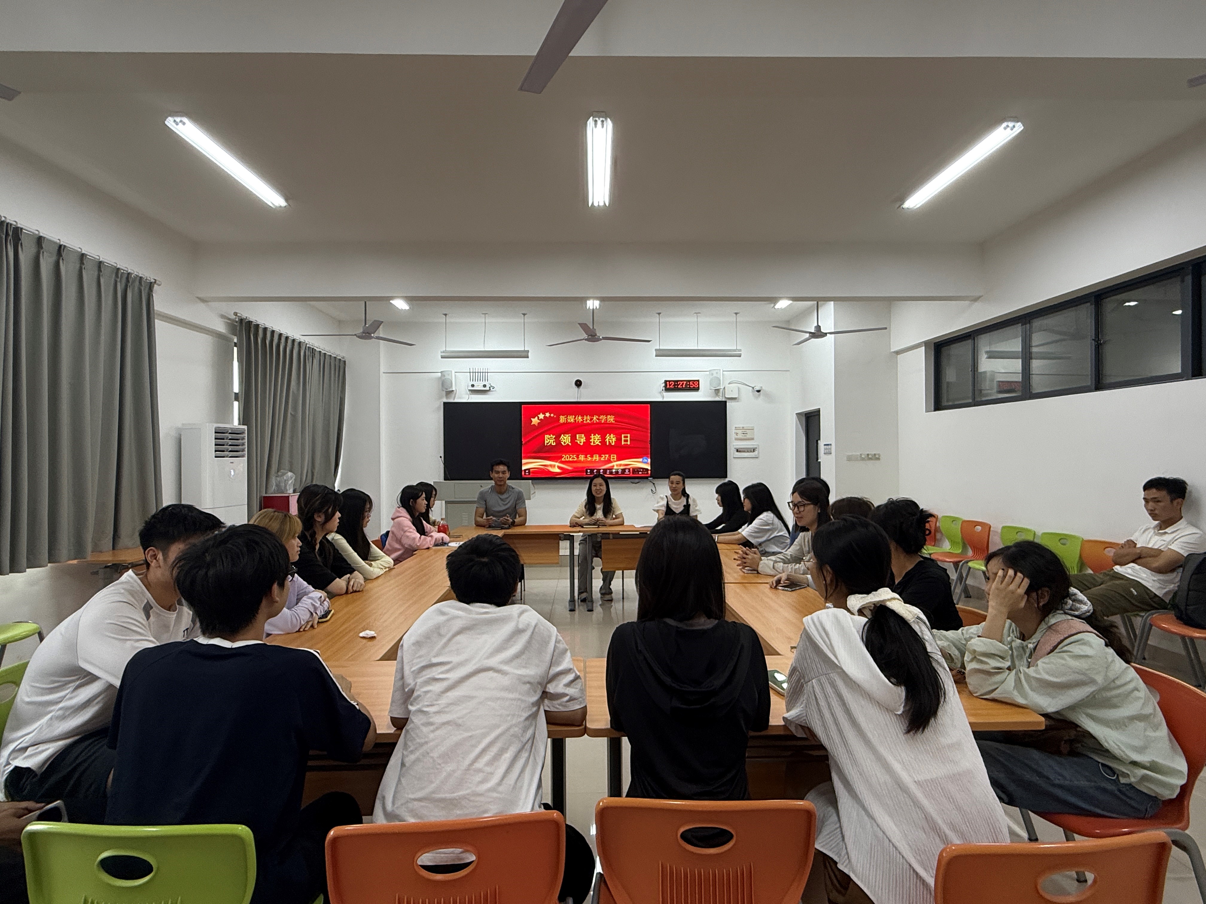 5月27日,新媒体技术学院院领导接待日在理实化一体楼502成功举办。新媒体技术学院党总支书记李烜接待了30余名来自学院不同专业的学生,学院党总支第三党支部书记、学院专职组织员、辅导员代表等参加了”院领导接待日“活动。