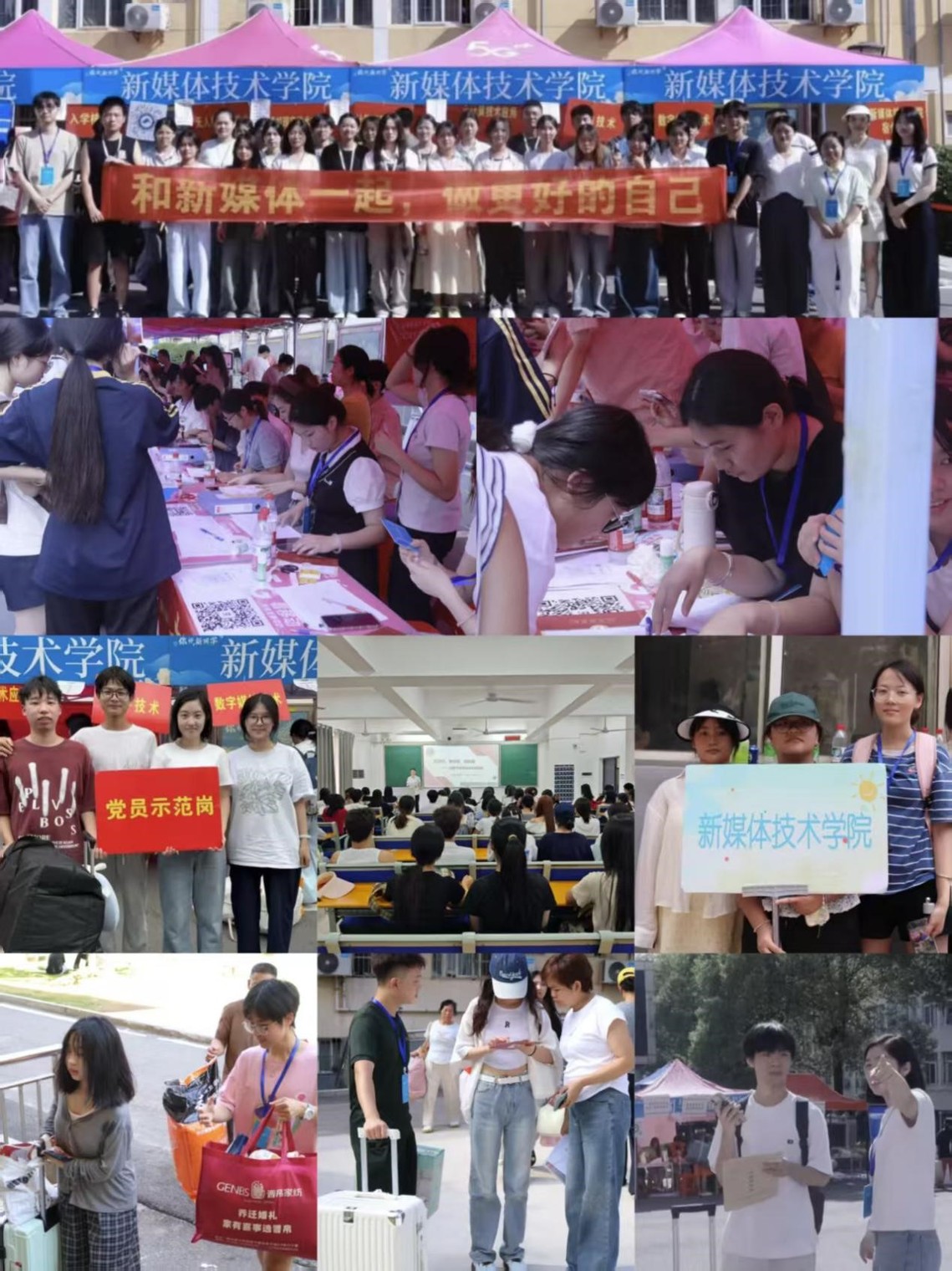 学院领导与新生辅导员们也早早来到迎新现场,与每一位新生和家长亲切交流,细致关怀,让初来乍到的新生感受到新媒体大家庭的温度。那一张张信任的笑脸、一句句贴心的问候,构成了这个秋天最动人的画面。