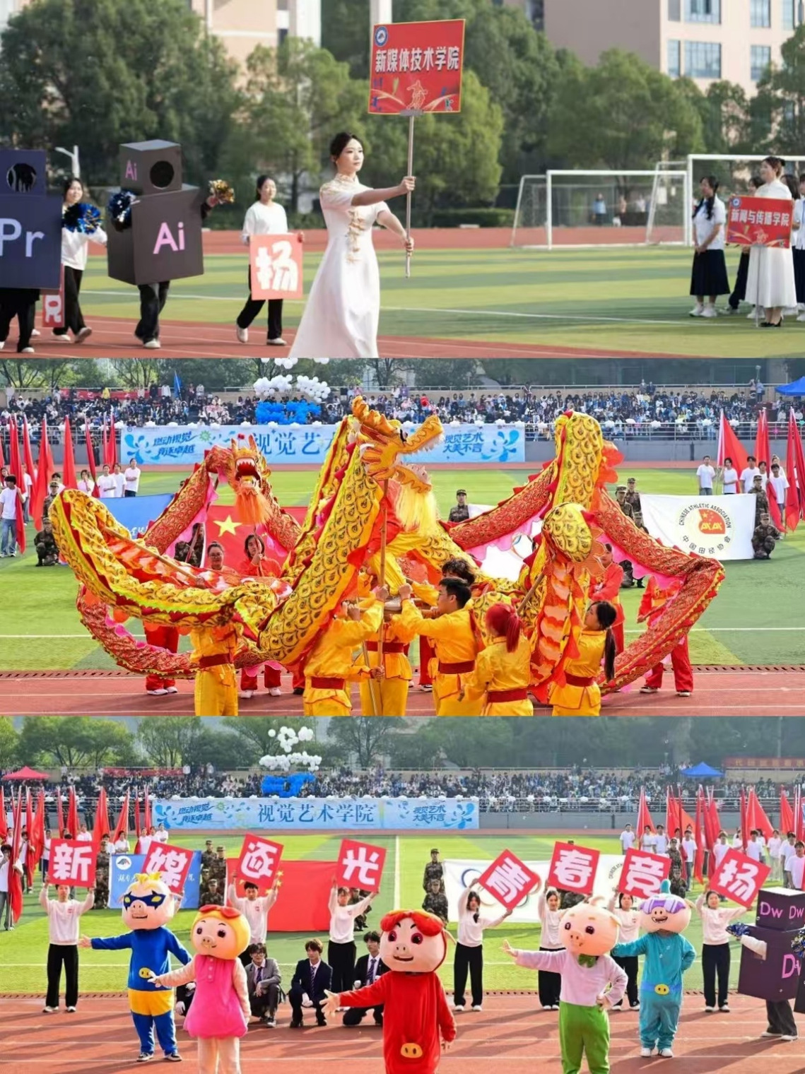 开幕式上,新媒体技术学院方阵尽显专业特色,将整齐舞蹈的活力、机械动作的科技感与舞龙表演的传统韵味相融合,展现出青年学子的蓬勃风采。伴随朝阳与国歌,五星红旗冉冉升起,本届校运会正式拉开帷幕。