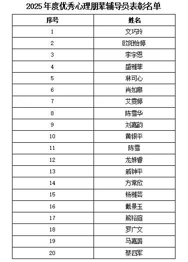 为表彰先进、传递力量,经个人申报、辅导员推荐、学院综合评定,现将2025年度优秀心理朋辈辅导员名单公布如下,向每一位用心守护心灵的“同行者”致敬!
