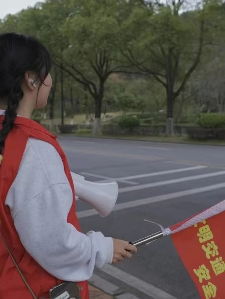 在淅淅沥沥的春雨中,志愿者们坚守岗位,一次次高举安全出行的旗帜,通过喇叭传播交通知识,体现了高度的责任感。红色的马甲包裹着他们炽热的心,志愿者们用自己的爱心维护着街道的秩序,保护着同学们的安全。