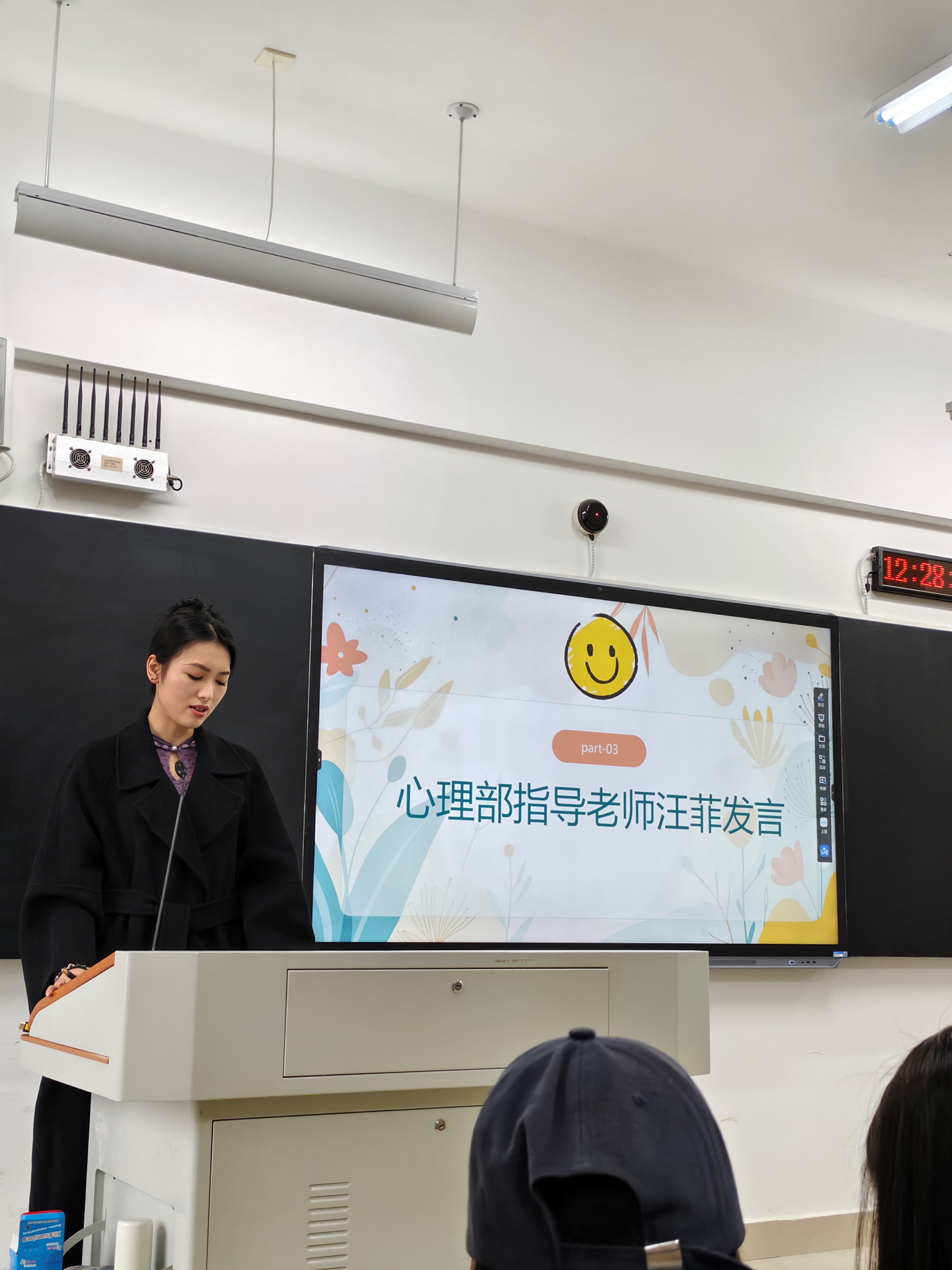 会上,心理部部长杨雅芸就上学期心理健康工作和下学期工作计划作汇报。报告中,她特别提到,心理委员需密切关注同学们的情绪变化,特别是假期后重新适应校园生活的状态;主动与同学们沟通,及时发现并反馈存在心理困扰的学生;定期组织心理健康主题活动,营造积极向上、和谐温暖的班级氛围,促进同学们的心理健康发展。