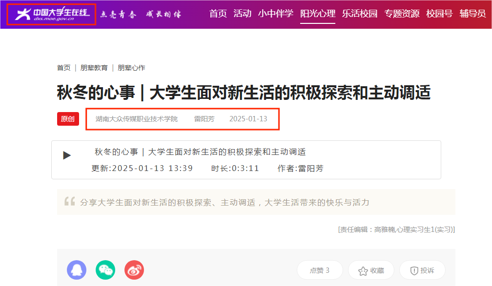 近日,由教育部中国大学生在线组织的“阳光心旅程,青春更昂扬”全国高校心理健康优秀作品暨“秋冬的心事”宣传展示活动公布遴选结果,由我院成城老师指导,软件技术2404班学生雷阳芳原创的心理音频作品《大学生的心理调适方法》成为学校唯一入选“朋辈心作”栏目心理健康优秀作品征集展示活动的学生作品。