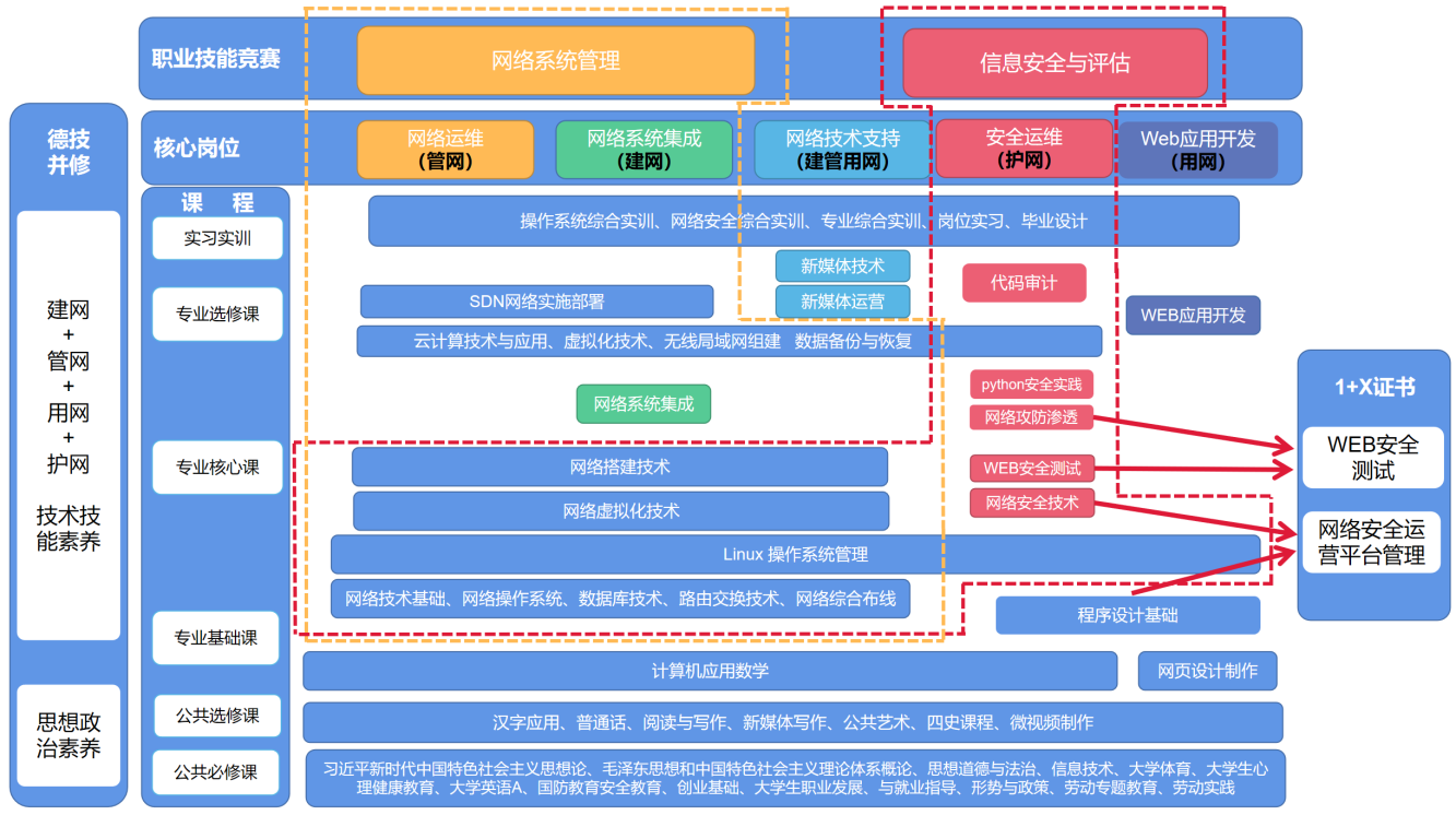 专业课程包括专业基础课、专业核心课、专业拓展课和实习实训与毕业设计四个模块。专业基础课程模块主要开设了包括计算机应用数学、网络技术基础在内的8门课程。专业核心课包括Linux 操作系统管理、网络安全技术、网络系统集成等7门课程。专业拓展课程包括了云计算技术与应用、网络虚拟化技术、数据备份与恢复、无线局域网组建等5门课程。实习实训与毕业设计模块包括了网络操作系统综合实训、网络安全综合实训、专业综合实训、毕业设计、岗位实习5门课程。共计25门课程,1880学时,105学分。