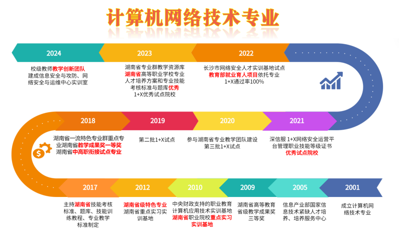 计算机网络技术专业是教育部第二批就业育人项目承接专业、湖南省特色专业、湖南省一流特色专业群重点建设专业、国家骨干校重点建设专业、首批中高职衔接试点专业。本专业拥有中央财政支持的省级重点专业实训基地、长沙市网络安全基地、国家级培训项目承建基地、省级职教师资培养培训基地,并且是湖南省计算机网络技术专业技能抽查标准与题库开发的主持单位。此外,还是教育部1+X证书制度的试点专业,并多次荣获优秀考核站点的称号。