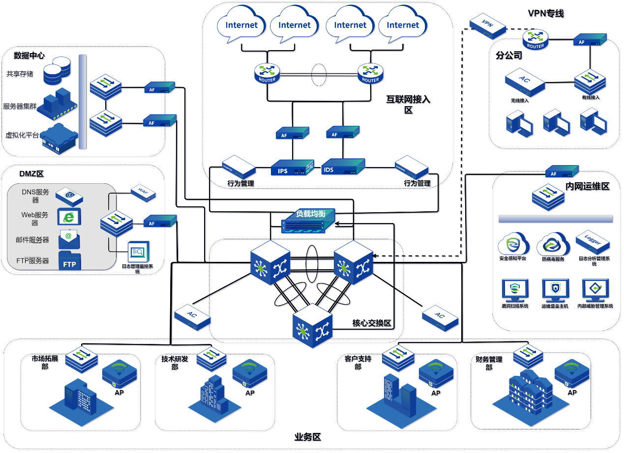 本项目使用有线无线融合网络,有线网络的传输稳定性和安全性高,信号传播距离远、抗干扰性强。无线网络灵活性更好,更易于维护和管理。有线和无线网络整合起来就有了无线网络的优势,游客们可以享受到安全、便捷、稳定的无线接入体验。部署深信服下一代防火墙作为出口网关,通过对内网进行区域划分,按区域策略进行隔离与安全防护,保障网络边界的安全。为满足网络安全法对提供网络服务的单位进行不少于180天日志存储的要求,在WLAN认证系统采用爱快无线认证,爱快认证系统较为便捷,支持手机号、微信号等社交账号认证,部署在VMware Vcenter虚拟机中可免费使用。除此之外,内网部署syslog日志服务器,存储防火墙、路由器等日志。内网也部署了协同办公的OA应用,满足内网办公的需求。