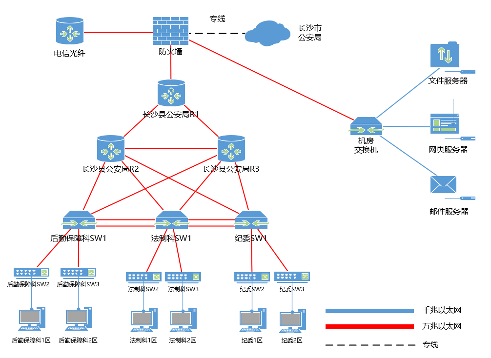 通过本次设计,为长沙县公安局解决了网络不稳定、不安全的问题,实现了拓扑规划、全网互通、路由交换、服务器配置,并使用防火墙来保障网络通信安全,网络拓扑分为核心层、汇聚层和接入层,在核心层上使用三台路由器相互连接能最大限度保障网络的稳定性,客户机使用核心层上的虚拟网关IP来实现负载均衡分担负荷。