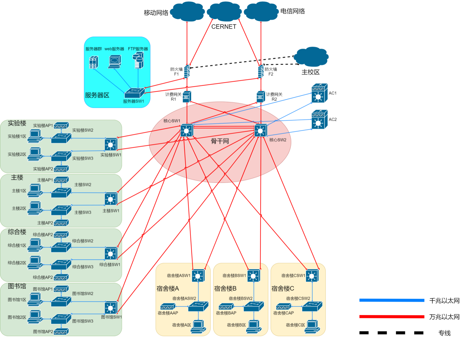 本项目为湖南科学技术大学构建了高性能、高可靠的网络架构。网络架构采用核心-汇聚-接入三层模型:核心层部署双核心交换机互连提升稳定性;汇聚层利用LACP链路聚合增加带宽与可靠性;接入层通过虚拟网关IP实现负载均衡。功能实现上:部署OSPF实现全网动态路由与互通,避免环路;配置MSTP增强网络容错性;核心交换机间启用LACP提升交换速率;路由器配置ACL规则监控并优化外网流量;防火墙保障网络安全,结合NAT防止外网攻击与IP浪费;DHCP自动分配IP地址避免冲突。服务器配置包括:文件服务器支持跨平台传输;共享服务器实现Linux/Windows文件及打印机共享;域名服务器加速内网解析;网页服务器部署OA系统提升办公效率。该项目显著提升了网络的性能、稳定性与安全性,满足高要求应用场景,并具备良好的扩展性与可维护性。