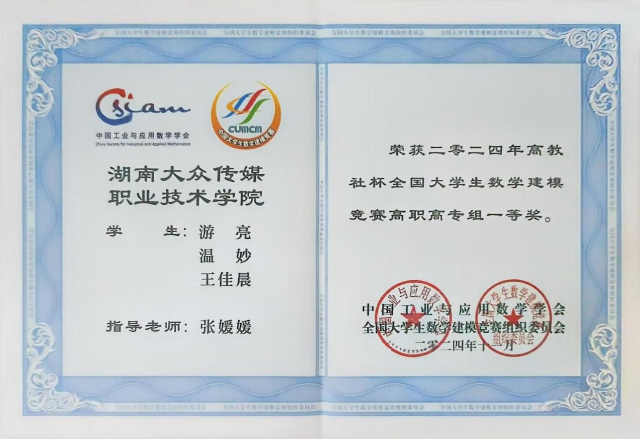 近日,第31届湖南省大学生数学建模竞赛暨全国大学生数学建模竞赛湖南赛区比赛圆满收官,由新媒体技术学院张媛媛老师指导,软件技术专业王佳晨、游亮、温妙三位同学组成的参赛团队,凭借扎实的专业知识与出色的实践能力在激烈角逐中脱颖而出,荣获湖南赛区一等奖,张媛媛老师获评“优秀指导老师”称号。